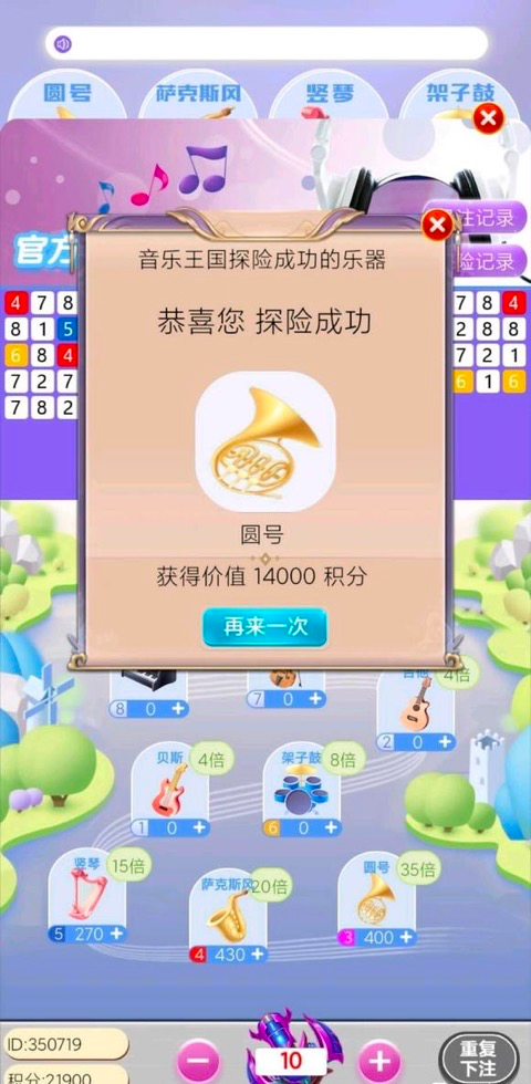 这款小游戏的规则非常简单,游戏页面中出现钢琴、吉他等8种乐器,每个乐器旁标注有不同的倍数。游戏每隔一分钟会弹奏一种乐器,玩家事先进行下注,并获得相应的回报。