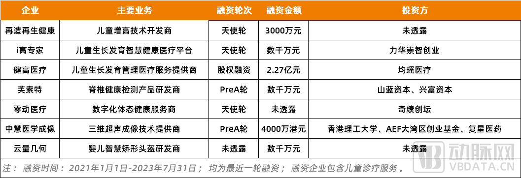 说完儿童心理健康,接下来重点关注的是儿童形体矫正市场,主要包括增高、减重以及脊柱侧弯。据动脉橙数据库不完全统计,过去2年,与之相关的初创企业已有7家顺利完成融资。