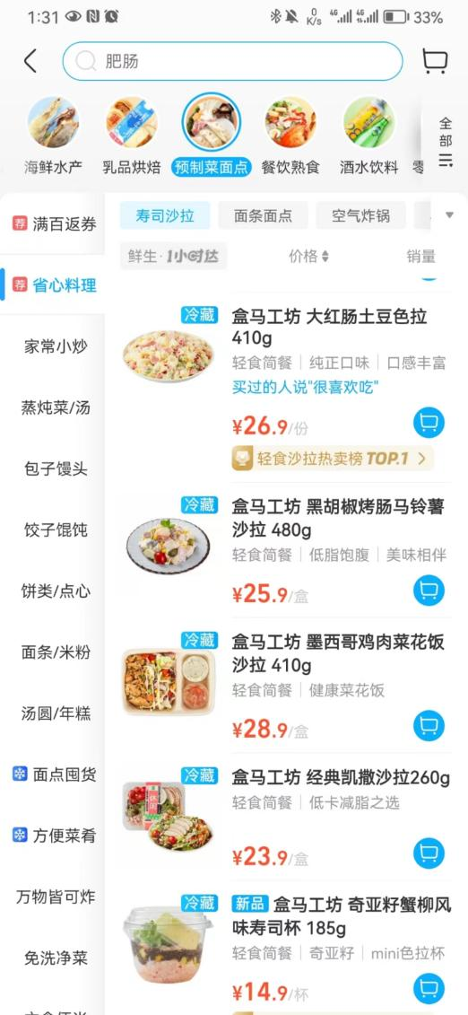 在盒马鲜生也能看到类似趋势,其预制菜分区中标示出低卡减脂、低脂饱腹等特点,为消费者提供更多健康轻盈的选择。