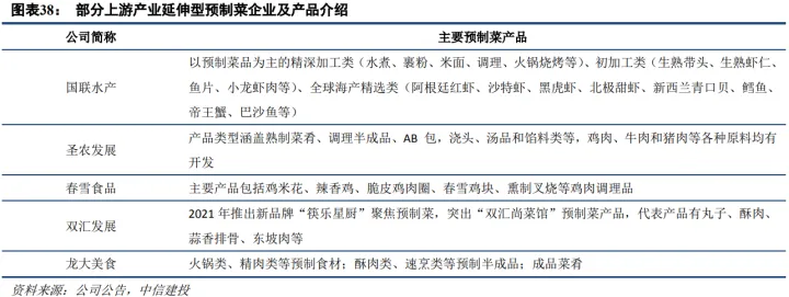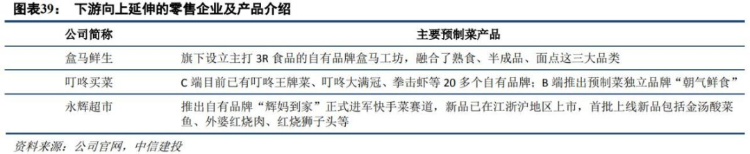 除了以上本来就和预制菜业务相关的综合实力较强的企业入局,其他还有原本的上游原料供应企业,如猪肉领域的双汇发展、水产领域的国联水产,以及下游直接面向C端人群的销售端,如盒马鲜生、叮咚买菜、永辉超市等新零售企业,都在不同程度上推出预制菜相关业务。