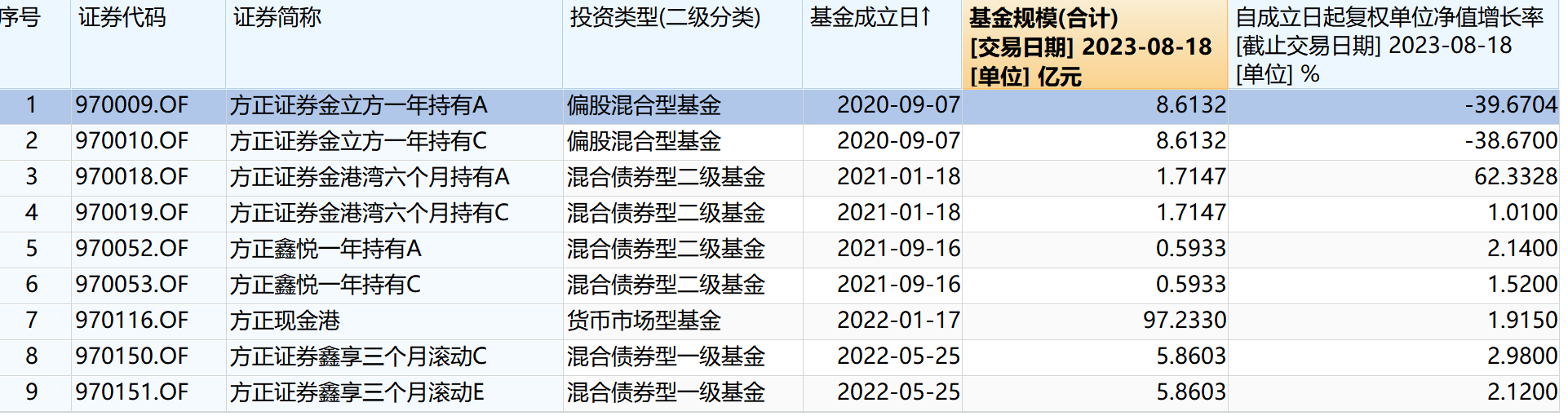 据wind统计,方正证券当前共完成大集合参公改造产品5只(仅统计主份额),金立方一年持有集合计划最先完成参公改造,也是唯一一支偏股混合型产品,截至2023年2季度末,产品管理规模8.61亿元。