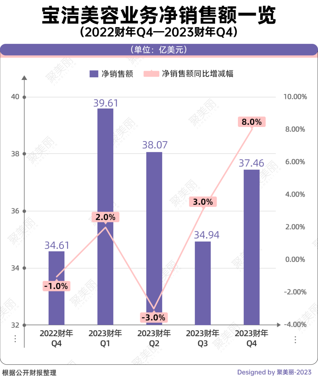 而在2023财年Q4(2023年4月1日-6月30日),宝洁美容部门销售额为37.46亿美元(约合人民币273.40亿),同比增长8%。