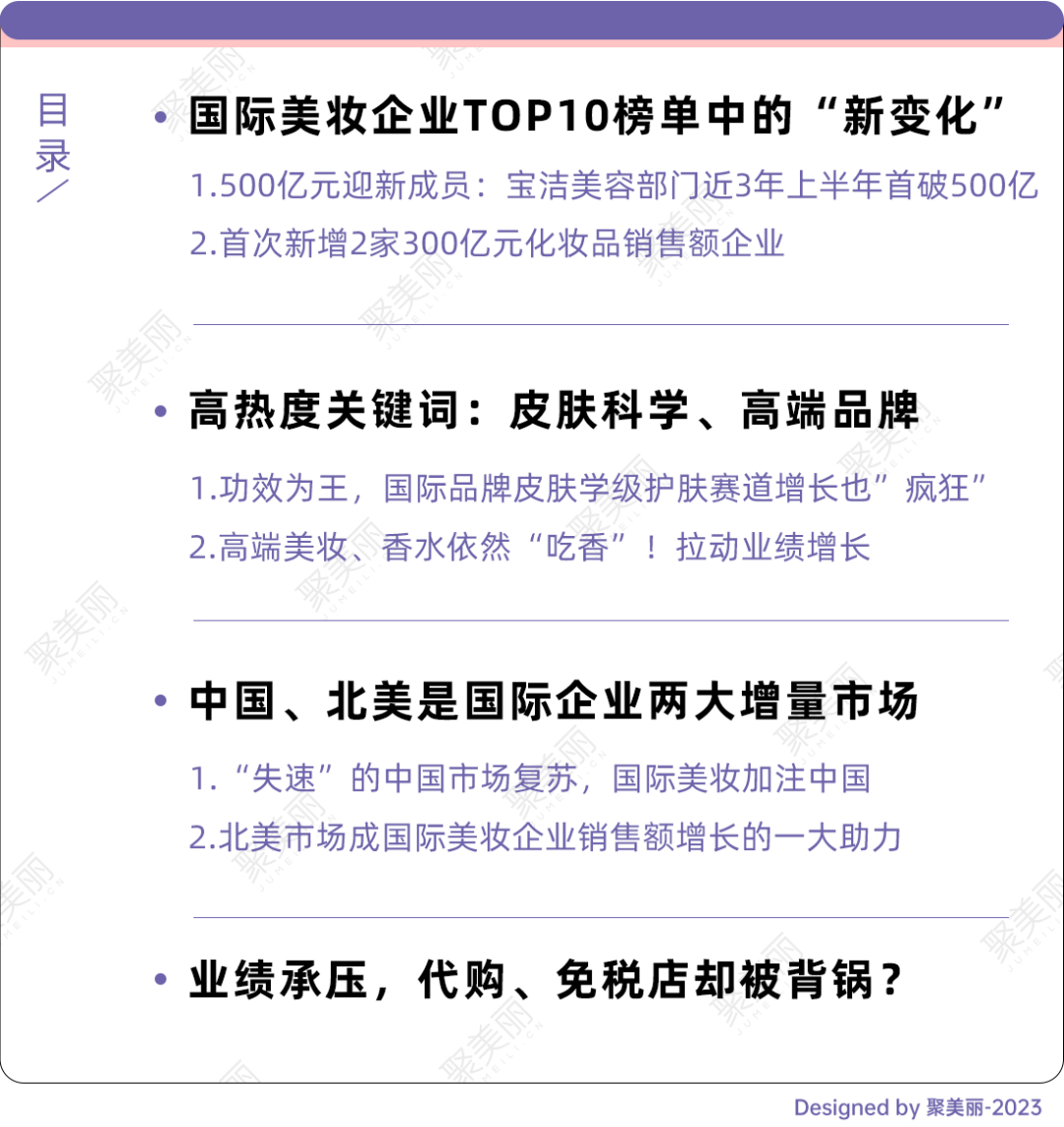为进一步了解国际美妆企业TOP10“变化”背后的原因,聚美丽将这10家企业的财报进行了梳理,本文将从销售额、品类、区域等层面的“新变化”,以及部分企业业绩承压的原因等对国际美妆TOP10榜单进行分析。