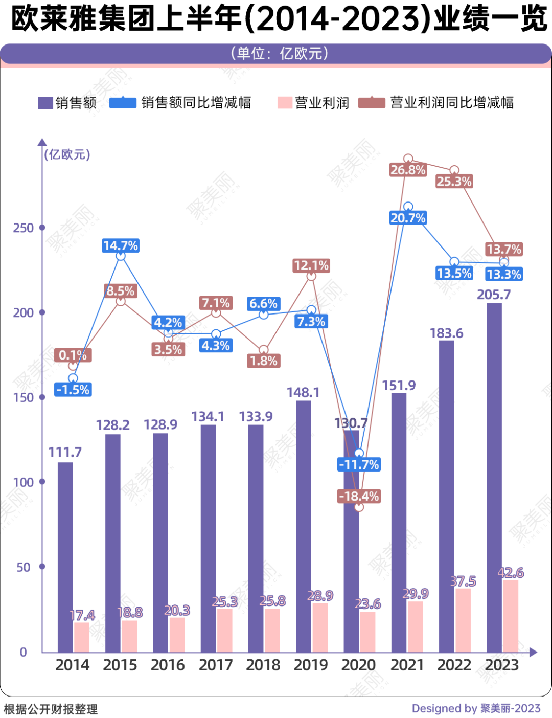 对比欧莱雅近10年来的财报可以发现,除了出现两次销售额下滑之外,其余都是增长的。且今年上半年不仅是欧莱雅集团自2020年Q3以来,连续11个季度实现业绩持续增长,更是欧莱雅集团近10年上半年业绩新高,也是首破200亿欧元(约合人民币1570.1亿)。