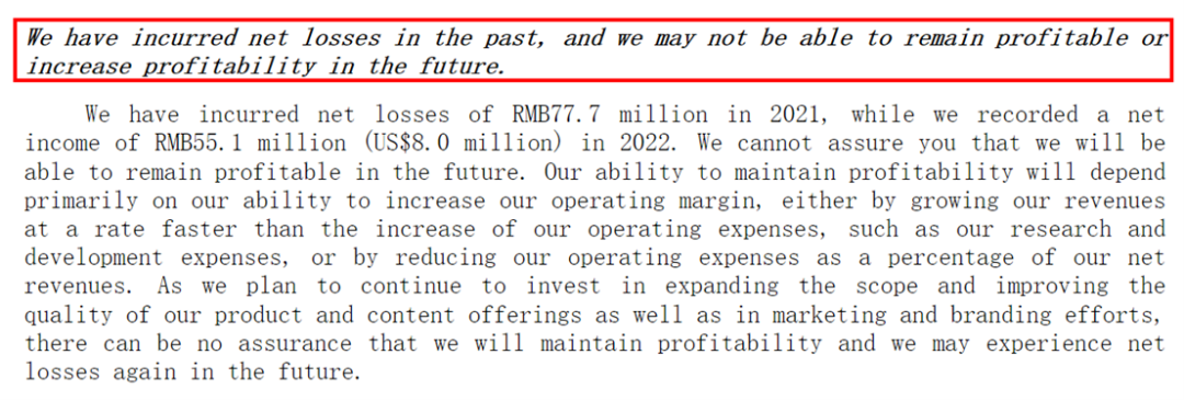 但对于未来的盈利能力,纳米盒却显得有些信心不足。在风险提示栏,纳米盒表示,“我们过去曾遭受过亏损,未来可能无法保持盈利或提高盈利能力。”纳米盒指出,其保持盈利的能力将主要取决于其增加营业利润的能力,要么通过其收入增长速度快于其运营费用增长速度,要么通过减少其运营费用占其净收入的百分比。不过,由于公司计划继续投资来扩大产品及内容提供的范围及质量,以及营收和品牌推广工作,因此无法保证盈利能力,未来可能会再次出现净亏损。