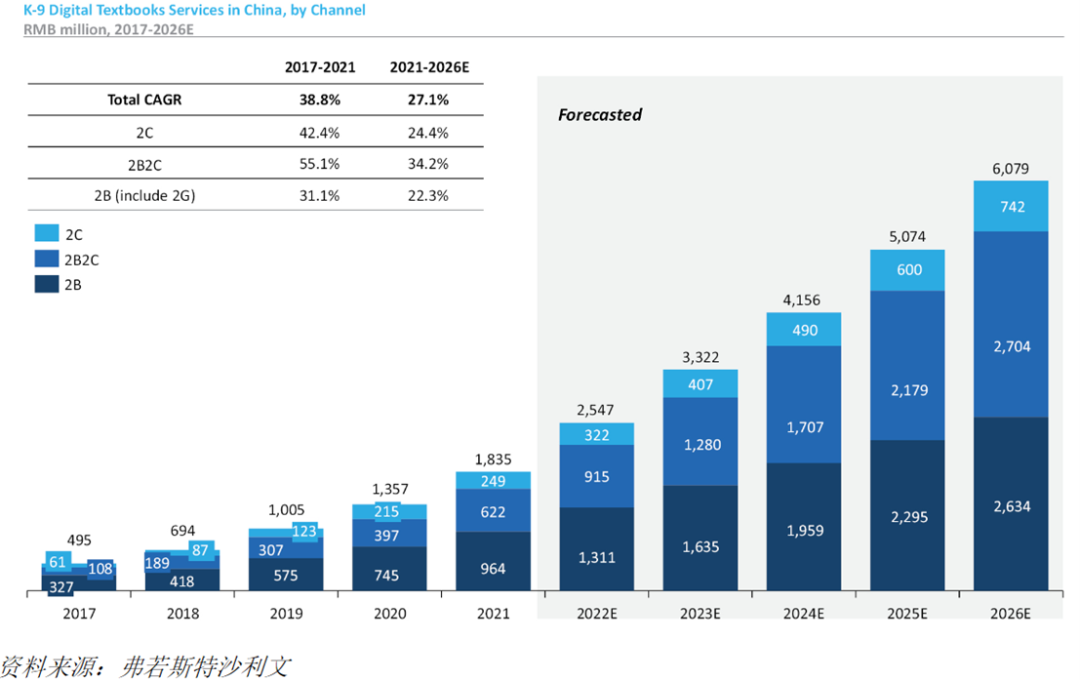 在招股书中,据弗若斯特沙利文的报告显示,中国K9的收入数字教育内容服务市场从2017年的人民币26亿元增至2021年的人民币85亿元,复合年增长率为33.8%。预计市场将继续呈上升趋势,到2026年收入将达到人民币277亿元,自2021年起复合年增长率为26.8%。