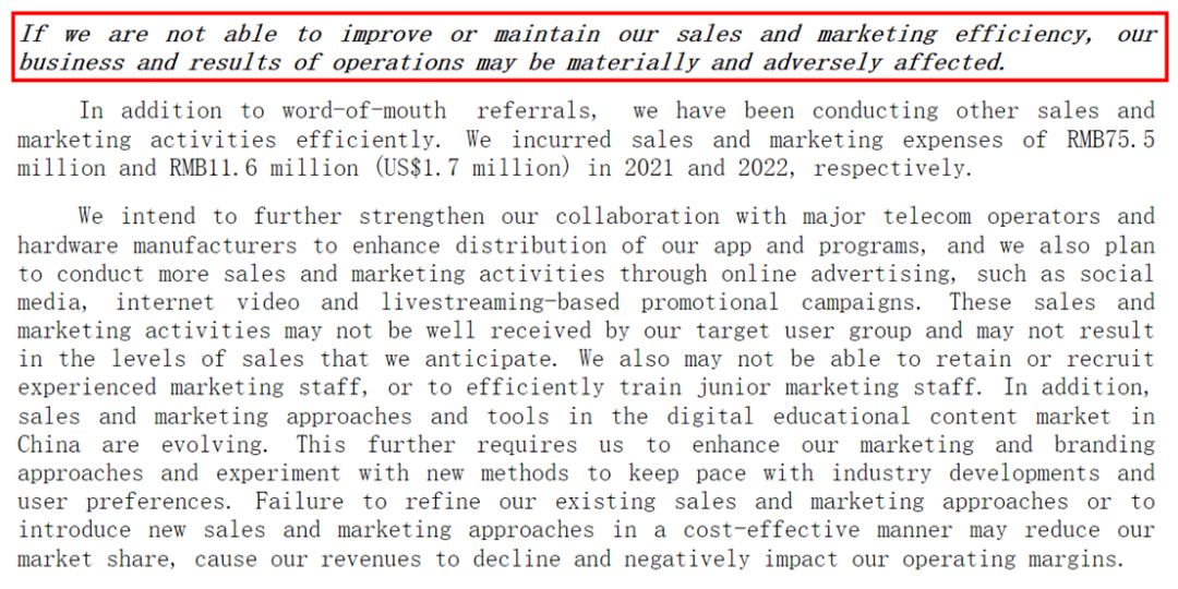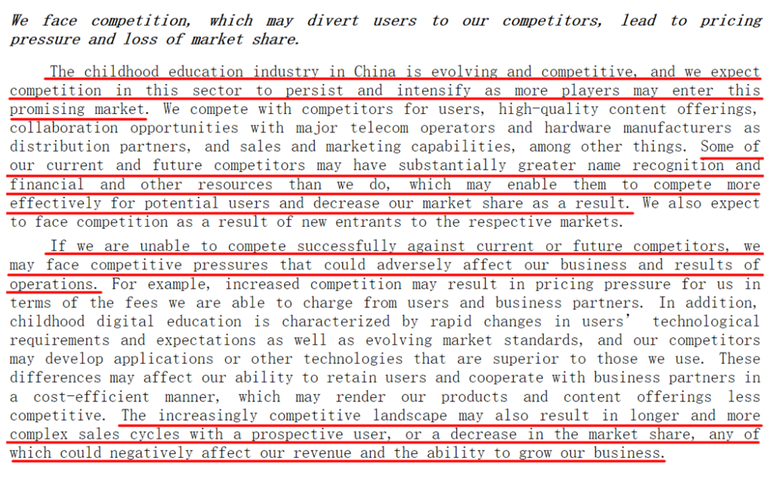 但纳米盒似乎并没有持续竞争的“底气”,在招股书风险提示中,纳米盒表示,中国的幼儿教育行业正在不断发展和竞争,预计随着更多参与者可能进入这个前景广阔的市场,该行业的竞争将持续并加剧。公司当前和未来的一些竞争对手可能比纳米盒拥有更高的知名度、财务和其他资源,这可能使他们能够更有效地争夺潜在用户,从而减少公司的市场份额,另外,或许还将面临新进入者进入各自市场的竞争。