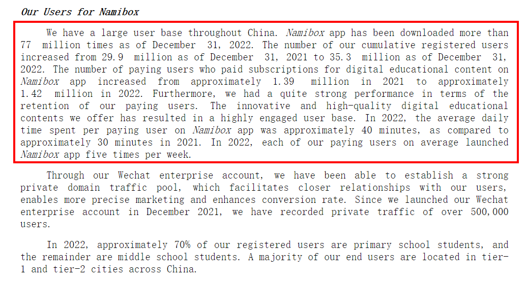 据招股书数据披露,截至2022年末,纳米盒APP上订阅数字教育内容的付费用户约142万名,2021年为约139万名。在付费用户留存率方面,2022年,每名付费用户平均每天在纳米盒App上的使用时长约为40分钟,而2021年约为30分钟。2022年,其付费用户平均每周启动5次纳米盒App。