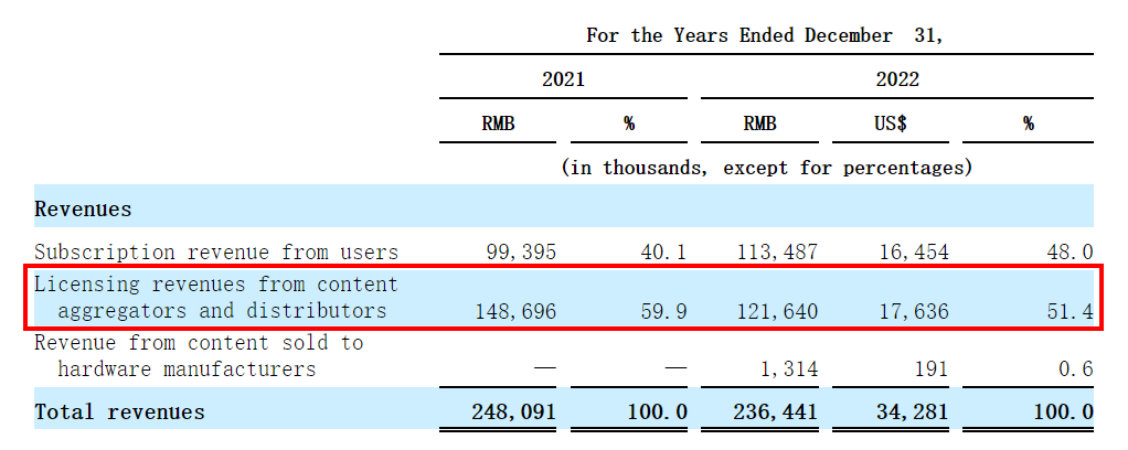其中,2022年度纳米盒来自用户订阅的收入为1.14亿元,占总营收的48%,较上年同期的9940万元增长了14.18%;来自内容聚合和分销商(主要是电信和广播运营商)的收入为1.22亿元,占总收入的51.4%,较上年同期的1.49亿元减少了18.19%;来自硬件制造商的收入为130万元,仅占总营收的0.6%。