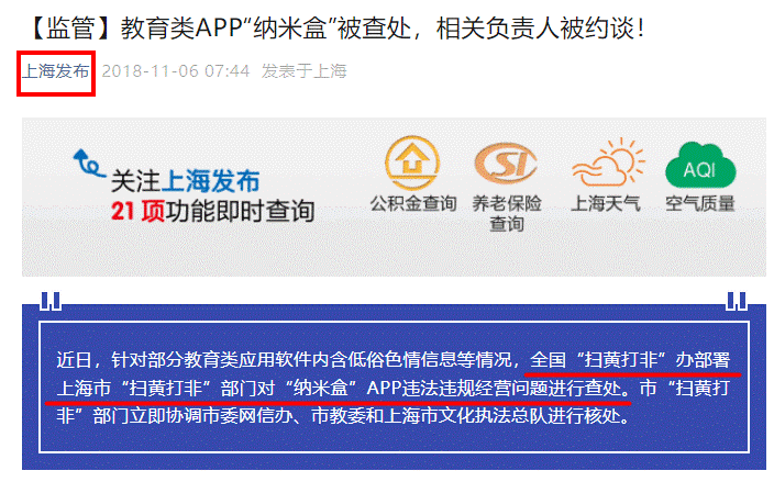 2019年1月7日,据中国扫黄打非网消息,针对近年兴起的学习类移动应用,有的涉嫌侵权盗版,有的互动板块存在大量色情低俗内容等问题,“扫黄打非”部门开展对应专项整治,监测核查“互动作业”“纳米盒”等20余个学习类APP,责令“纳米盒”APP关闭问题板块并给予罚款8万元。