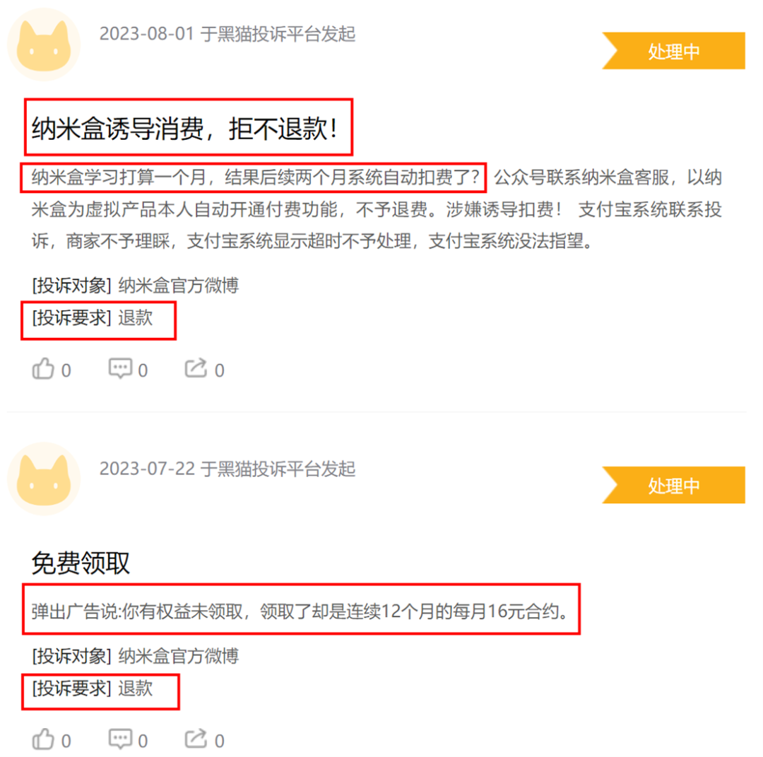 直至目前,在黑猫投诉平台,关于纳米盒“自动扣费”“拒不退费”等相关投诉也屡见不鲜。