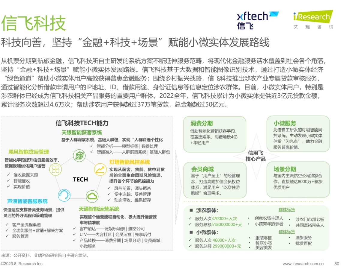 报告中特别提到,信飞科技基于大数据和智能图像识别技术,通过打造小微实体经济“绿色通道”帮助小微实体用户高效获得普惠金融服务;围绕乡村振兴战略,信飞科技推出涉农产业专属贷款审核服务,通过智能化分析借款申请用户的IP地址、ID、借款用途、身份证信息等信息定位涉农群体。目前,小微实体用户,特别是涉农群体已经成为信飞科技相关产品服务的重要用户群体。2022全年,信飞科技累计为小微实体提供近3亿元贷款金额,累计服务次数超过4.6万次;帮助涉农用户获得超过37万笔贷款,总金额超过50亿元。