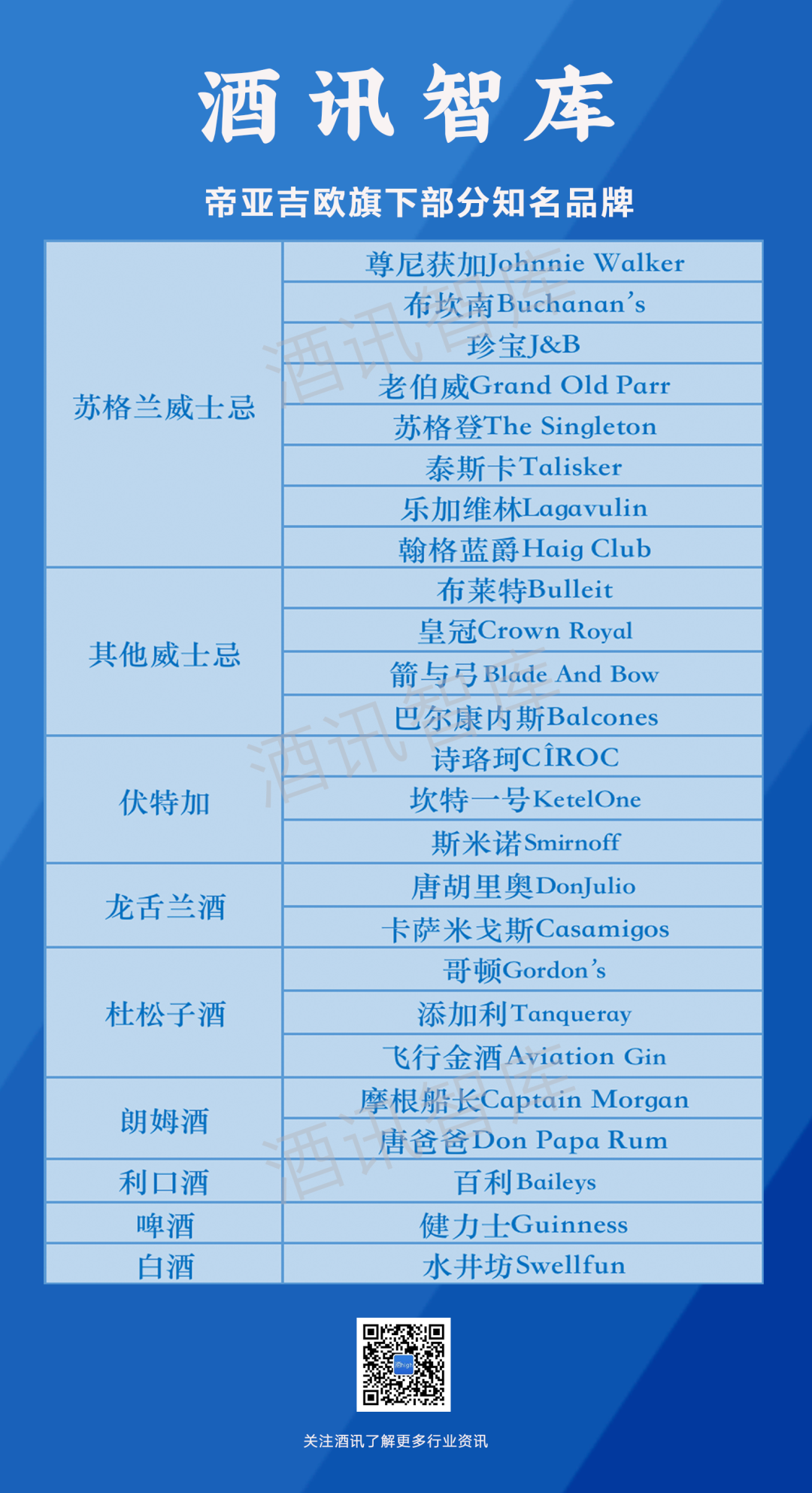 作为全球最大的烈酒公司,帝亚吉欧在180多个国家拥有200多个品牌,旗下酒类品类涵盖了威士忌、伏特加、龙舌兰酒、杜松子酒、朗姆酒、白酒等几乎所有烈酒品类,占据了全球30%以上洋酒市场份额。