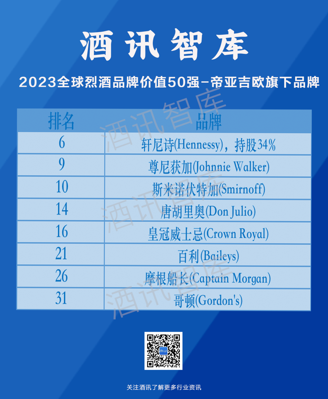 在英国品牌评估机构Brand Finance发布的“2023全球酒类品牌价值榜”中,帝亚吉欧旗下20余款主要烈酒品牌,就有7款入榜TOP30。是所有入榜酒业集团中,数量最多的一家。