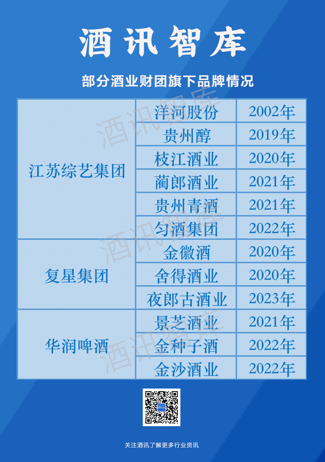 目前三家最为瞩目的“财团”,江苏综艺集团也是当前进行酒业兼并收购频次最高、数量最多的一家,共计6个白酒品牌。华润系与复星系相当,前者旗下包含景芝酒业、金种子酒、金沙酒业3家白酒品牌,后者旗下则有金徽酒、舍得酒业、夜郎古酒业3家白酒品牌.