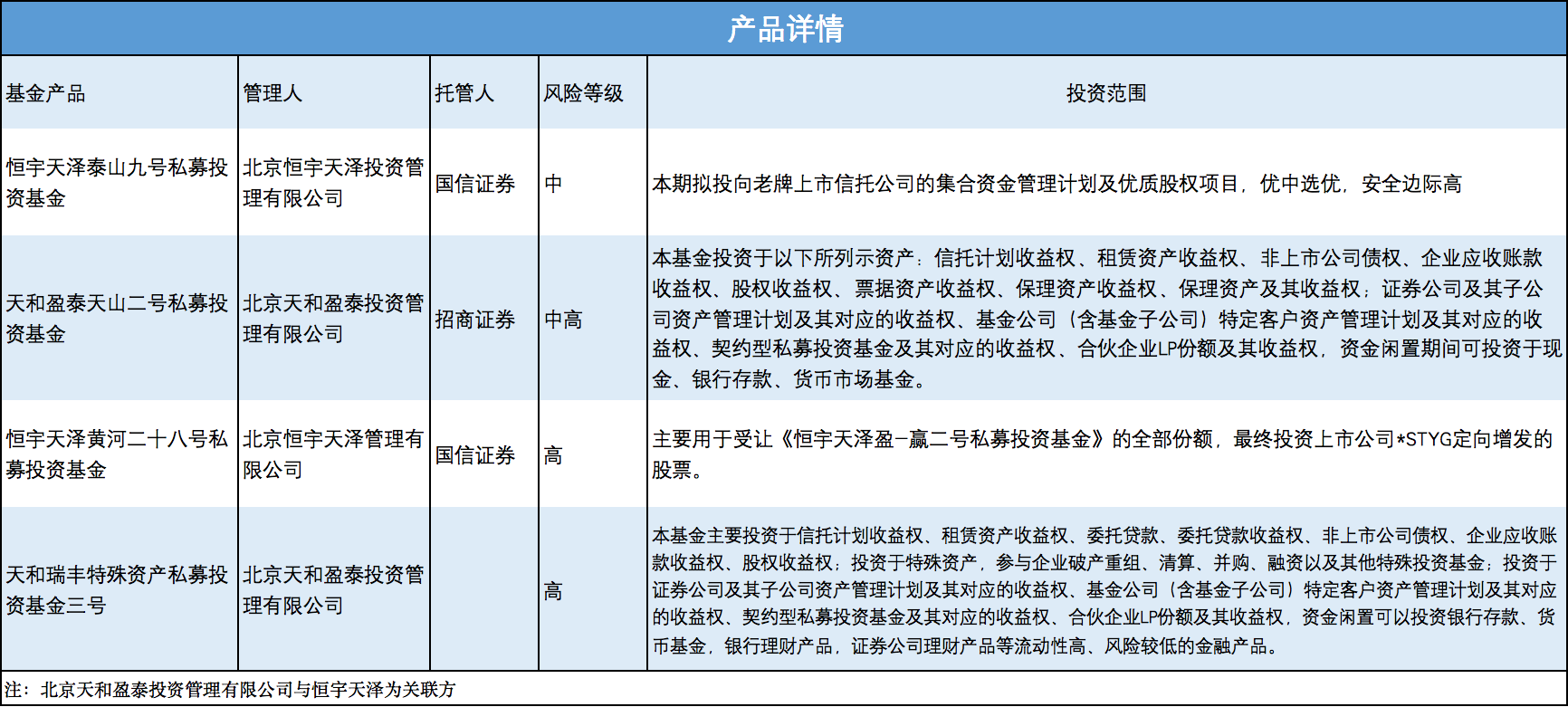 根据各私募投资基金产品详情和招募说明书,界面新闻记者总结了恒宇天泽泰山九号、天和盈泰天山二号、恒宇天泽黄河二十八号以及天和瑞丰特资三号基金的管理人、托管人、风险等级和投资范围。