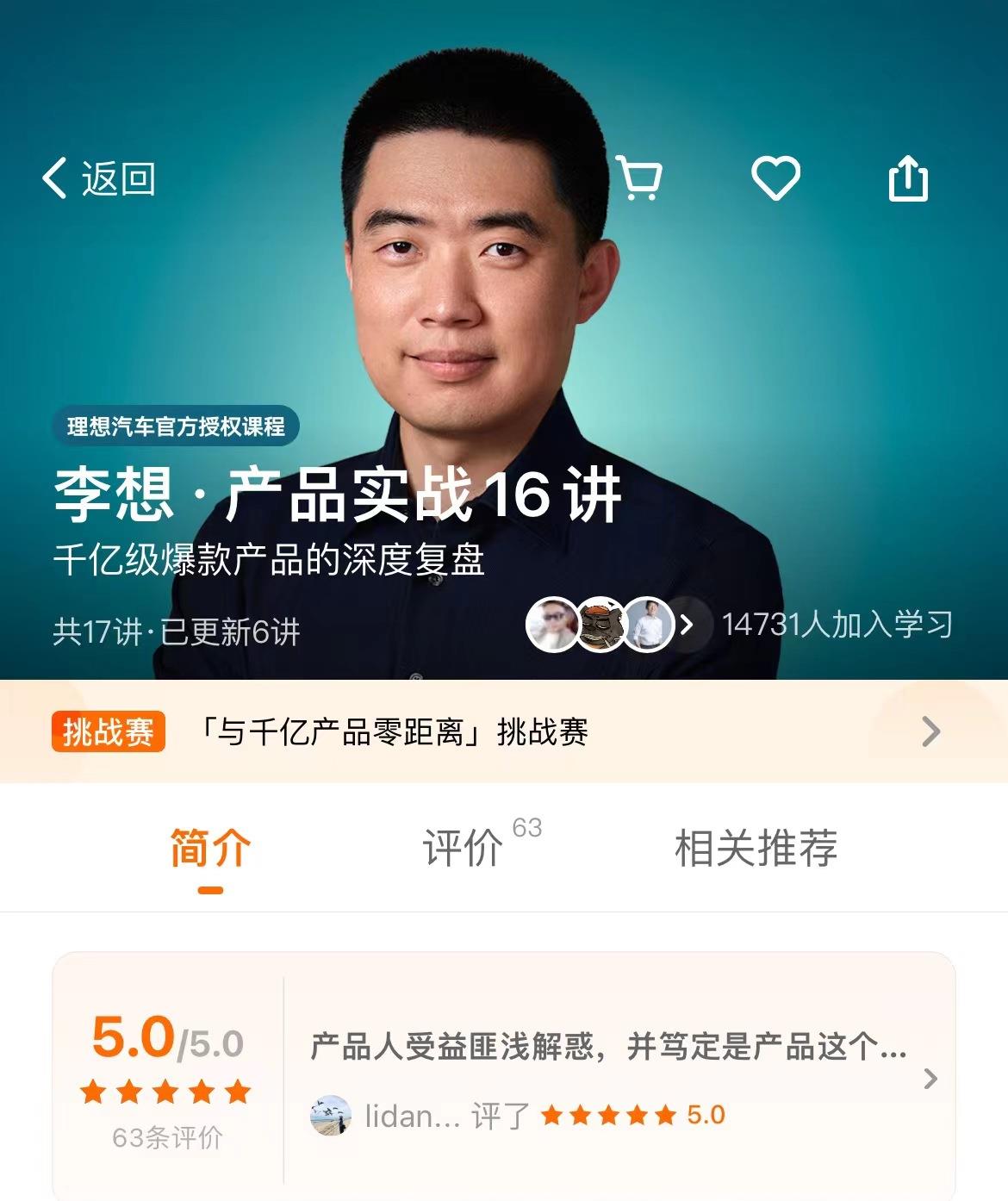 8月21日,李想受邀在知识学习平台上推出的《产品实战16讲》课程正式上线。截至发稿,这门售价99元的课程共吸引了1.47万人加入学习,其中免费的课程发刊词共吸引了2万余名收听。