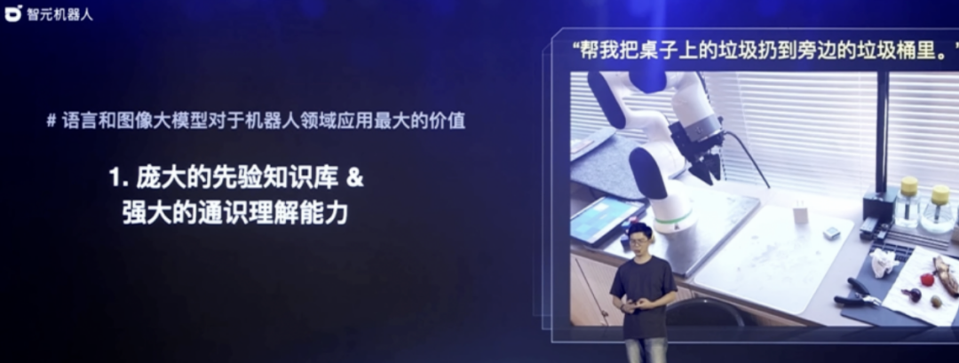 比如,让机器人把桌上垃圾扔到垃圾桶里,不再需要告诉它垃圾是什么、垃圾桶是什么,所有的知识都来自预训练GPT的模型。