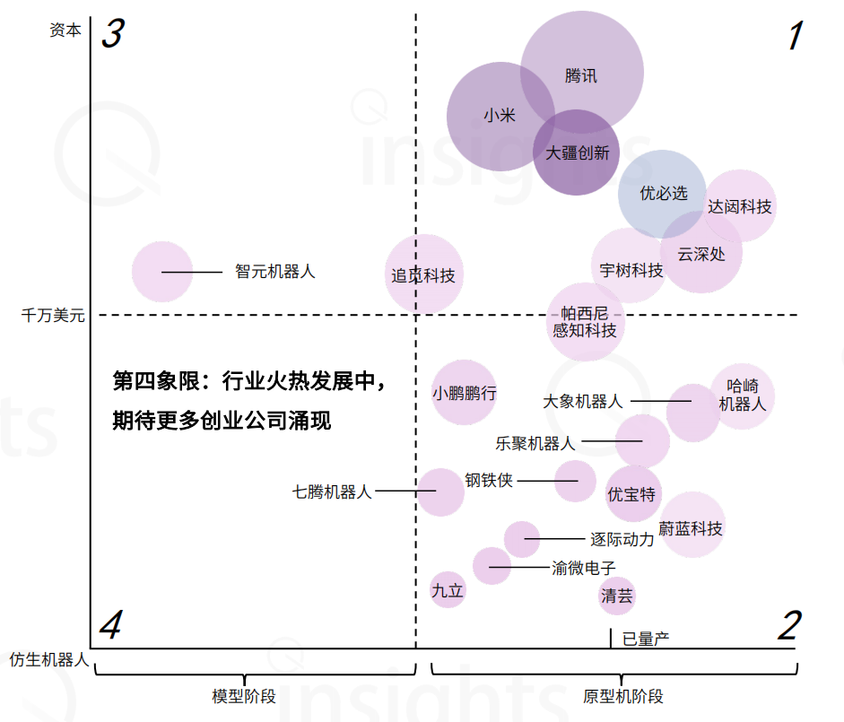第一象限,主要是有强劲资本 撑的明星企业,如腾讯、小米和大疆等。这类企业,往往拥有雄厚的资金、技术,并且具备可观的量产能力,可以在没有量产压力的情况下,不计成本研发原型机,推动行业技术发展。