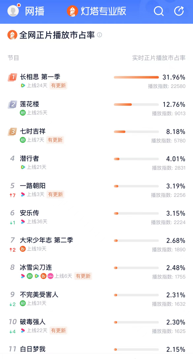 然而《莲花楼》上线以来,热度并没有如欢瑞世纪预期的那样,成为暑期爆款。据灯塔专业版数据显示,《莲花楼》上线25天,实时正片播放市占率仅有12.76%,而晚一天上映、上线24天的《长相思第一季》,实时正片播放市占率高达31.96%,《莲花楼》的光芒与热度显然被《长相思第一季》所掩盖,好口碑并未带来太高的热度。