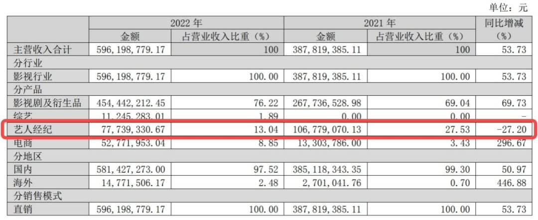 值得注意的是,杨紫在欢瑞的六年期间,成长为90后流量花旦的代表性人物,主演的《香蜜沉沉烬如霜》、《亲爱的热爱的》都曾是大热爆款,并获得不俗的成绩。在杨紫离开后第一年,2022年欢瑞世纪在艺人经纪板块实现营业收入7773.93万元,较上年同期减少27.2%。