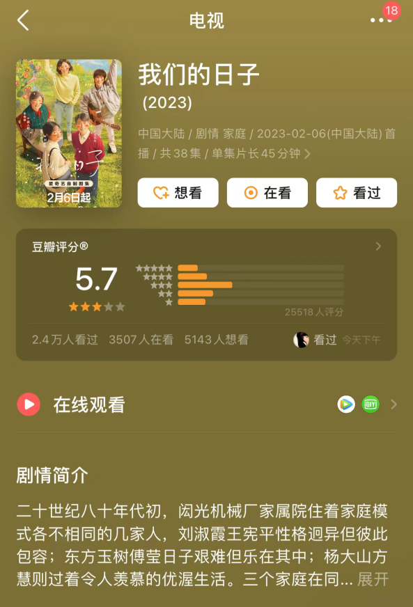 其中,《我们的日子》早在今年2月6日便在中央电视台综合频道、爱奇艺、腾讯视频首播。据悉,《我们的日子》是由李小冉、李乃文主演,豆瓣评分仅有5.7分,并没有激起太多的水花。