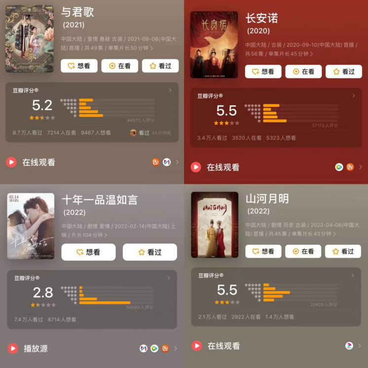 值得注意的是,近年来,欢瑞世纪并没有推出太多的口碑佳作。由冯绍峰、陈宝国主演的《山河月明》豆瓣评分仅有5.5;成毅、张予曦主演的《与君歌》豆瓣评分5.2;成毅、赵樱子主演的《长安诺》豆瓣评分5.5。欢瑞世纪参与联合投资的电影《十年一品温如言》豆瓣评分仅有2.8分。