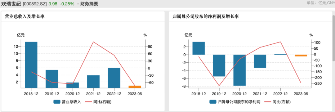 从财务数据来看,欢瑞世纪这半年来过得并不好。公司2023年上半年实现营业收入9569.95万元,比上年同期减少73.31%;归属于上市公司股东的净利润为-4339.93万元,比上年同期减少246.32%。