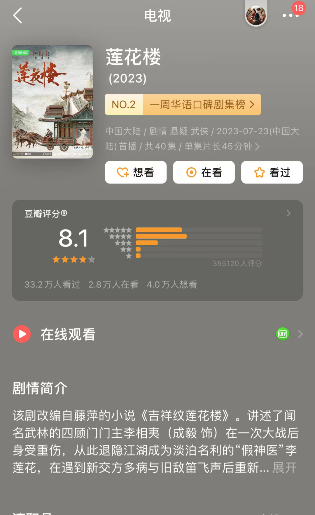 而7月23日播出的《莲花楼》的主演为成毅、曾舜晞,由藤萍的小说《吉祥纹莲花楼》改编而来,豆瓣开分高达8.1分,可以说是武侠悬疑口碑剧。