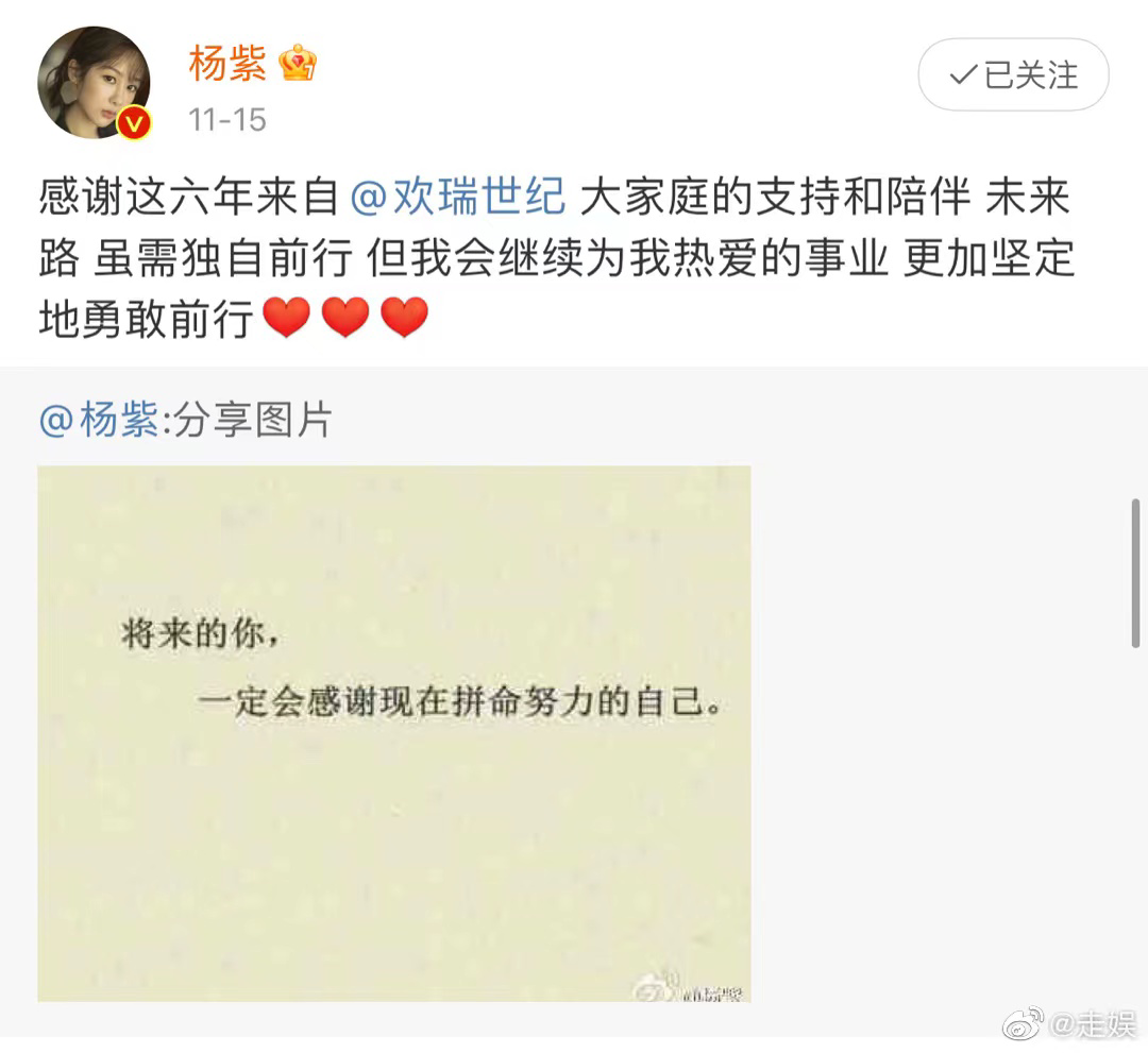 2015年11月15日,杨紫宣布签约欢瑞世纪,正式成为旗下艺人,而在六年后的2021年11月15日,杨紫官宣离开欢瑞世纪。