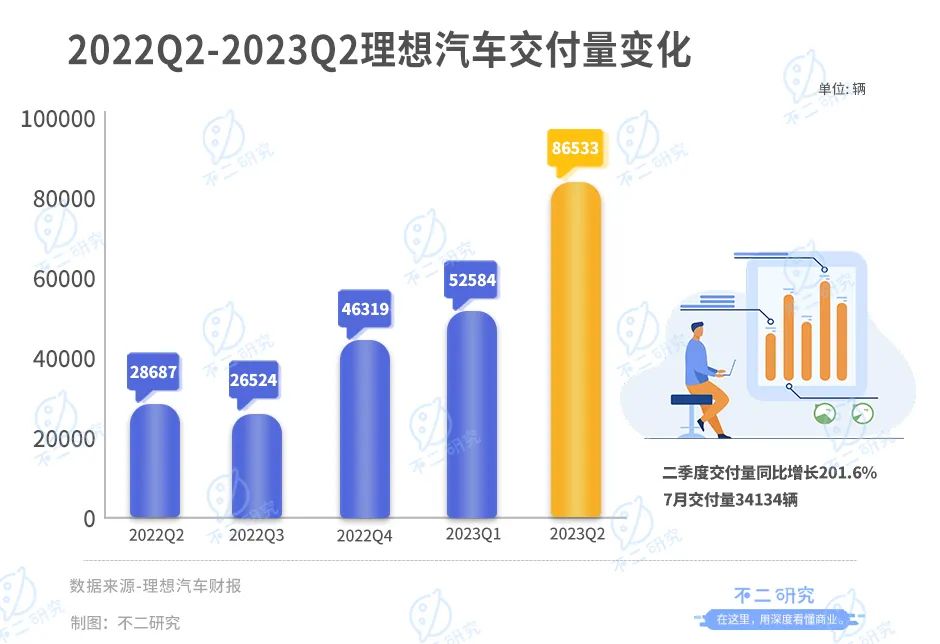 根据理想最新公布的数据显示,其二季度交付量达到86533辆,同比增长201.6%,环比增长65%;且7月交付量34134辆。