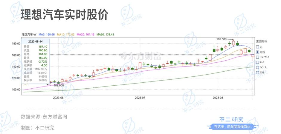 截至8月14日港股收盘,理想汽车报收160.90港元/股,对应市值3354亿港元(约折合人民币3111亿元)。