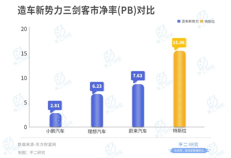 「不二研究」对比造车新势力三剑客的PE值(市盈率)、PB值(市净率)发现,截止美东时间8月12日美股收盘,除理想汽车外,造车新势力的PE值均为负数,PB值依次为:小鹏2.81、理想6.23、蔚来7.63,而另外的特斯拉的PB值为15.06。