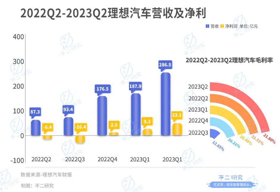 「不二研究」据其二季报发现:今年二季度,理想汽车的营收为286.5亿元,同比增长228.1%;净利润为23.1亿元,同比扭亏为盈,环比增长147.4%。