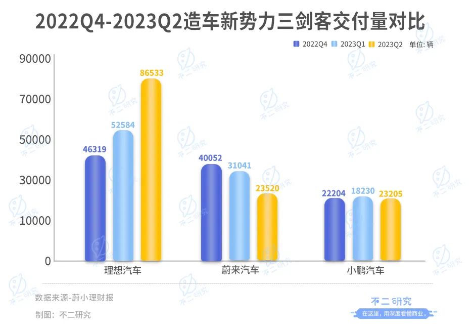 2022年四季度,理想交付量为46319辆,同比增长31.5%;而蔚来、小鹏同期的交付量分别为40052辆与22204辆,同比都有所增长。