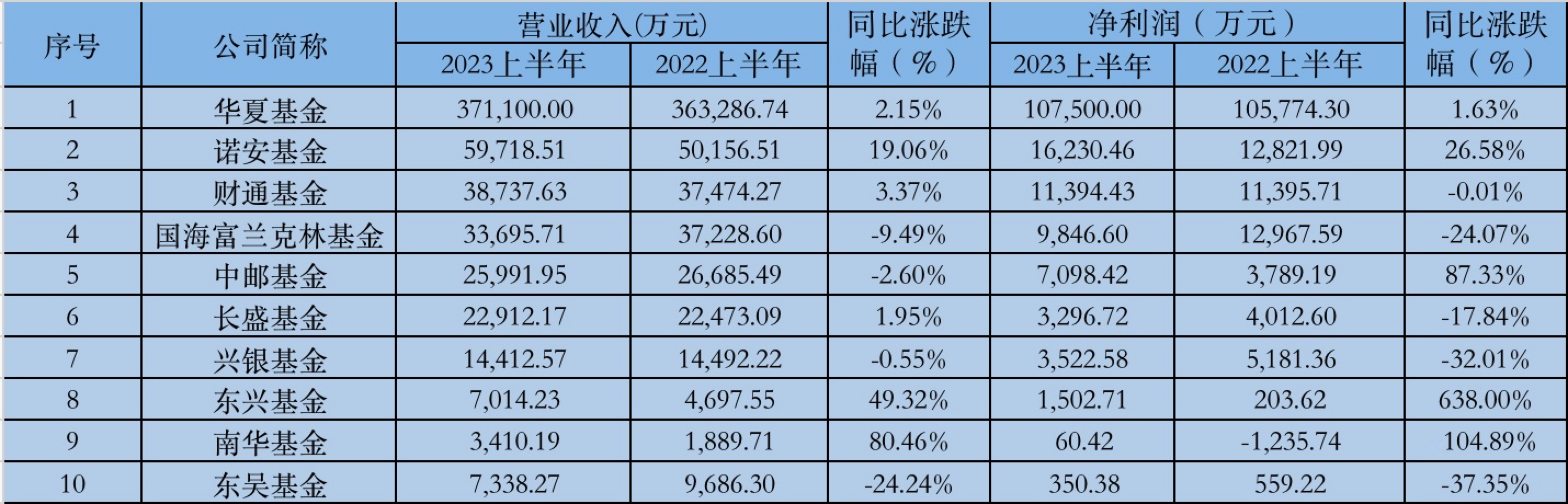 截至8月21日晚间,共有10家基金公司上半年营业收入和净利润数据已披露,包括华夏基金、诺安基金、财通基金、国海富兰克林基金、中邮基金、兴银基金、长盛基金、东兴基金、东吴基金和南华基金。
