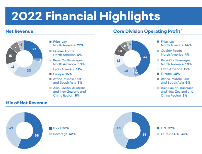 根据百事2022年财报,相比于2021年,百事公司在2022年的净收入提升了9%。其中,百事在北美的净收入占整体净收入的61%,其在美国市场的净收入占整体的57%,该公司饮料和食品的净收入分别为42%和58%。