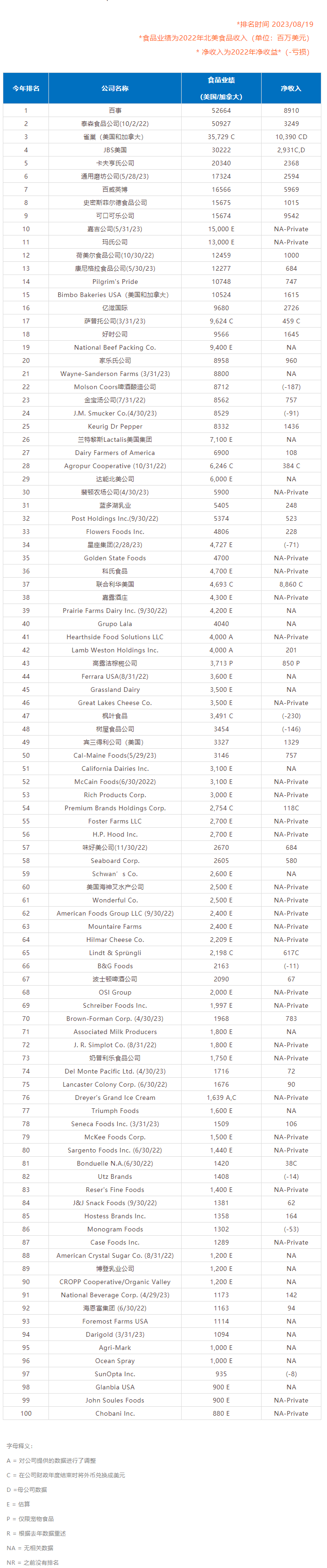 以下为2023年北美食品饮料Top100完整榜单。