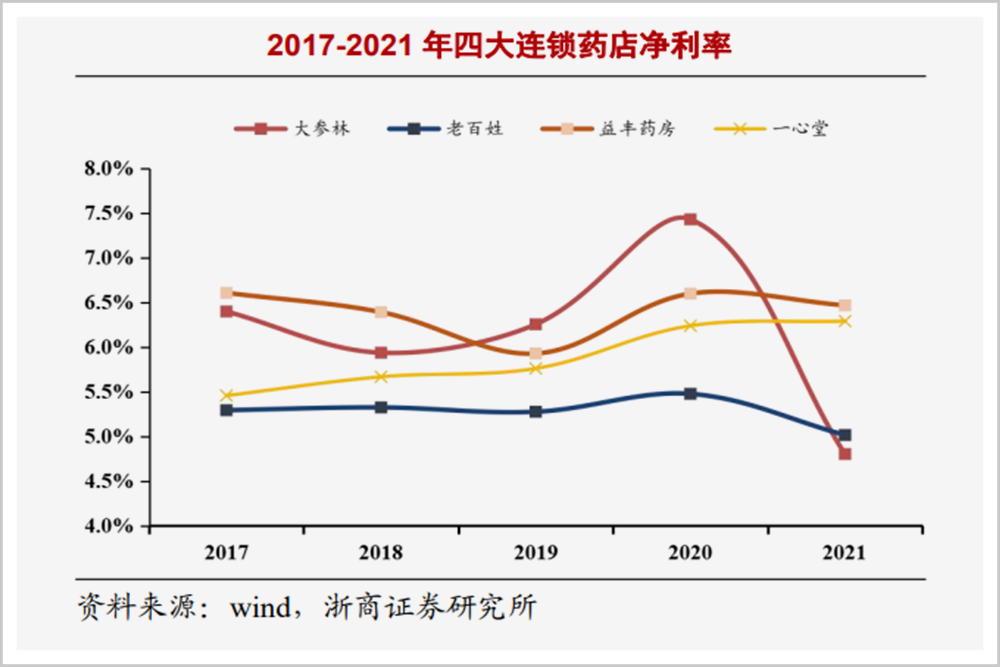 以四大连锁药店,益丰药房、大参林、老百姓和一心堂为例,尽管平均毛利率近40%,但净利率只有5%。
