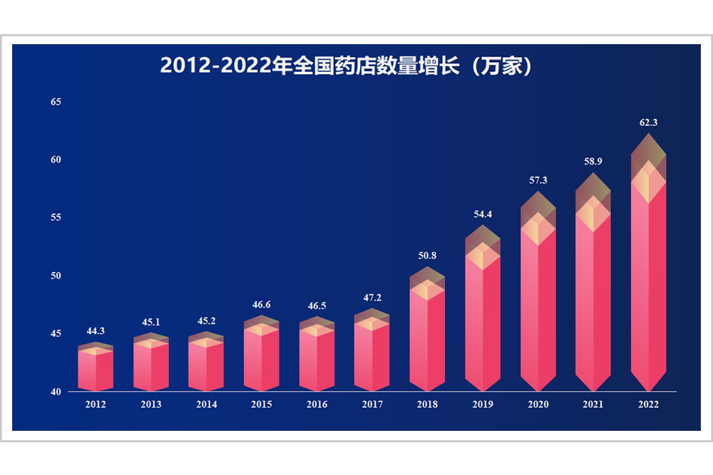 2012年,我国一共有44.3万家药店。到了2022年,这个数字增至62.3万家。十年净增18万家。