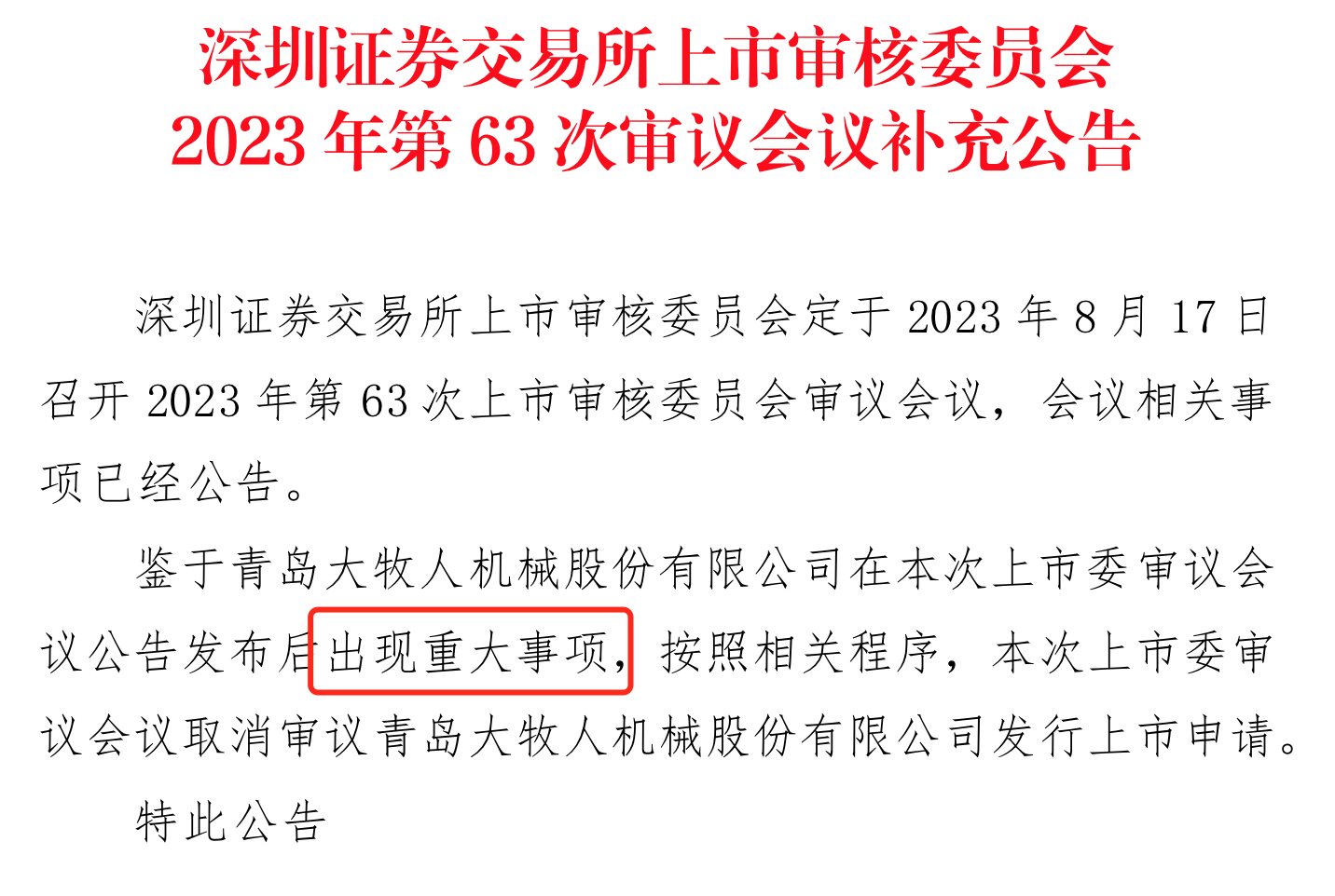 近日,青岛大牧人机械股份有限公司(以下简称“大牧人”)成为主板注册制后首家上会前取消审核公司 ,究其原因,是因为该公司在上市委审议会议公告发布后出现重大事项。按照相关程序,上市委审议会议取消了审议大牧人的发行上市申请。