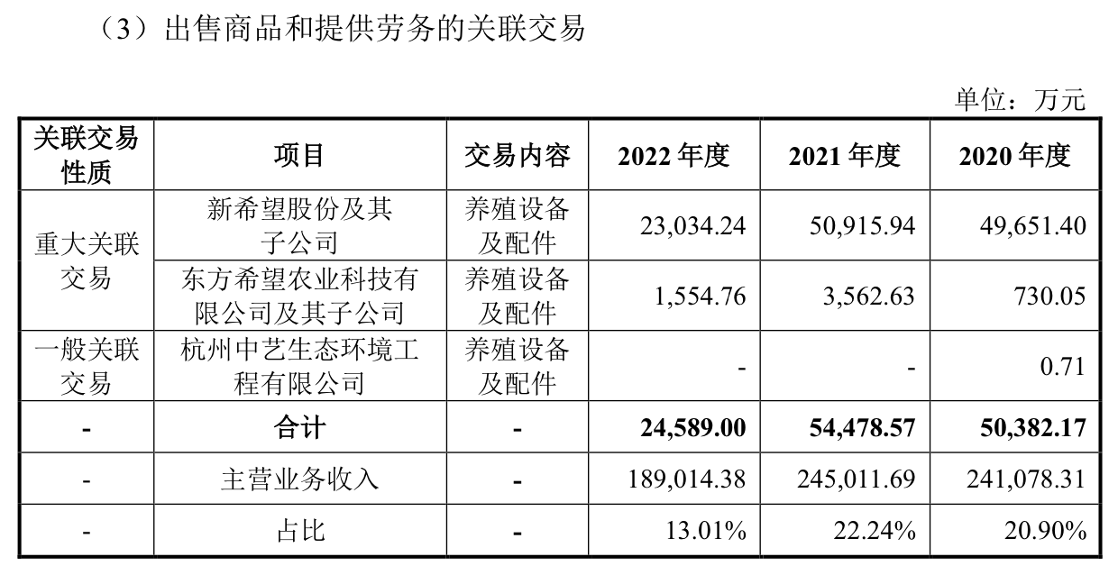 有数据显示,2020年至2022年大牧人和新希望方面的重大关联交易金额达到4.9亿元、5.09亿元、2.3亿元。截至2023年3月31日,新希望股份及东方希望的在手订单金额分别为2.51亿元和6413.16万元,占在手订单总额比例分别为8.14%和2.08%。