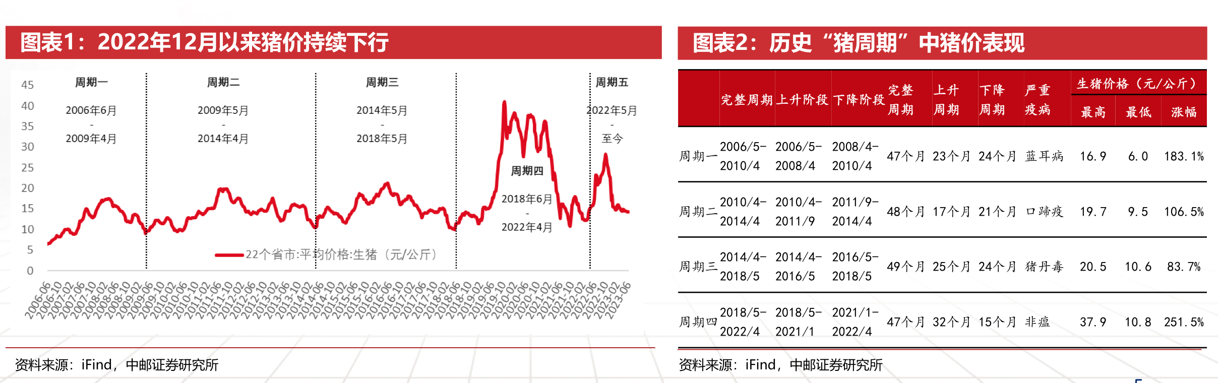 根据中邮证券的研究,我国“猪周期”在4年左右,大周期中又包含小周期。2006年以来,生猪市场经历过了4次完整周期,分别为:2006-2010年,2010-2014年,2014-2018年以及2018年-2022年上半年,猪价最高涨幅分别高达183%、106%、84%和252%。生猪价格在2022年5月开启新的一轮上涨趋势,但在2022年10月末到达阶段性高点后开始持续下降。2023年2月中旬,生猪价格达13.8元/公斤的阶段性低点后,有过短暂反弹。但由于需求疲弱而供给充足,猪价3月中下旬后再度开启下跌趋势。截至7月9日生猪价格为14.0元/公斤,依然处于低位。中邮证券预计,从当前生猪供需情况来看,下半年猪价或有季节性回升,但行业依然处于下行周期。