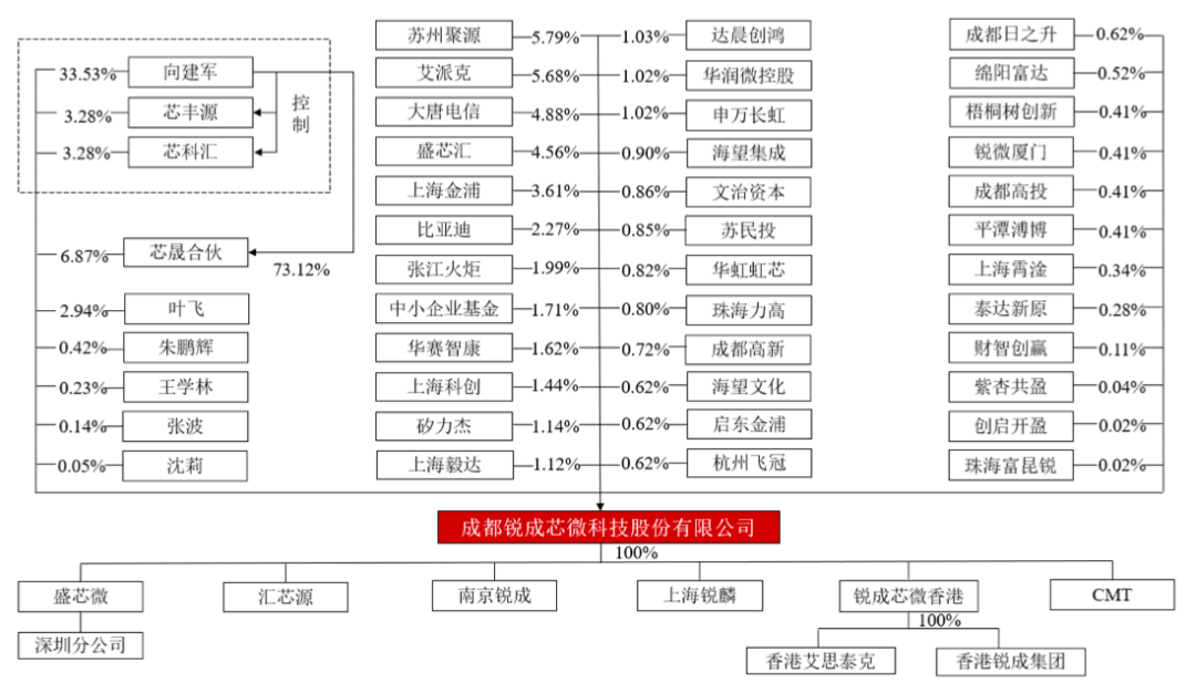 招股书显示,向建军直接持有锐成芯微33.53%股份,同时作为芯丰源、芯科汇普通合伙人及芯晟合伙的有限合伙人间接持股0.34%、0.94%、5.02%,合计控制公司40.09%的股份表决权,为实际控制人。