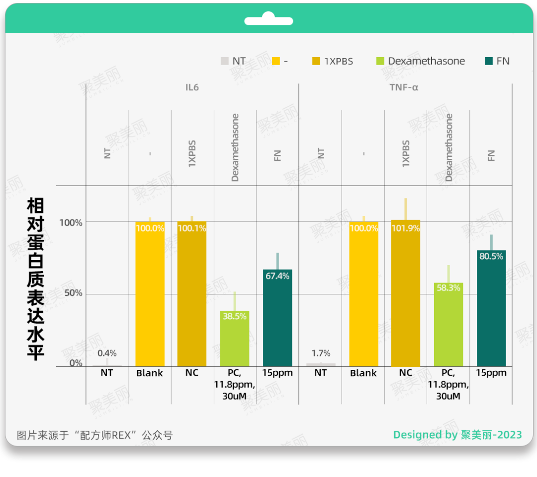 在功效表达上,该成分主要发挥修护、舒缓的作用。研究表明,Prorylia FN如甄 纤连蛋白能够作用于TRPV-1、IL-6、TNF-α等经典的皮肤炎症通路,并且在炎症因子的相关试验中,该成分的抑制作用与激素类药物地塞米松相当。