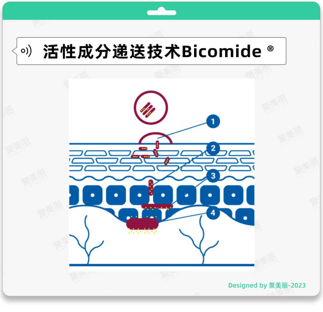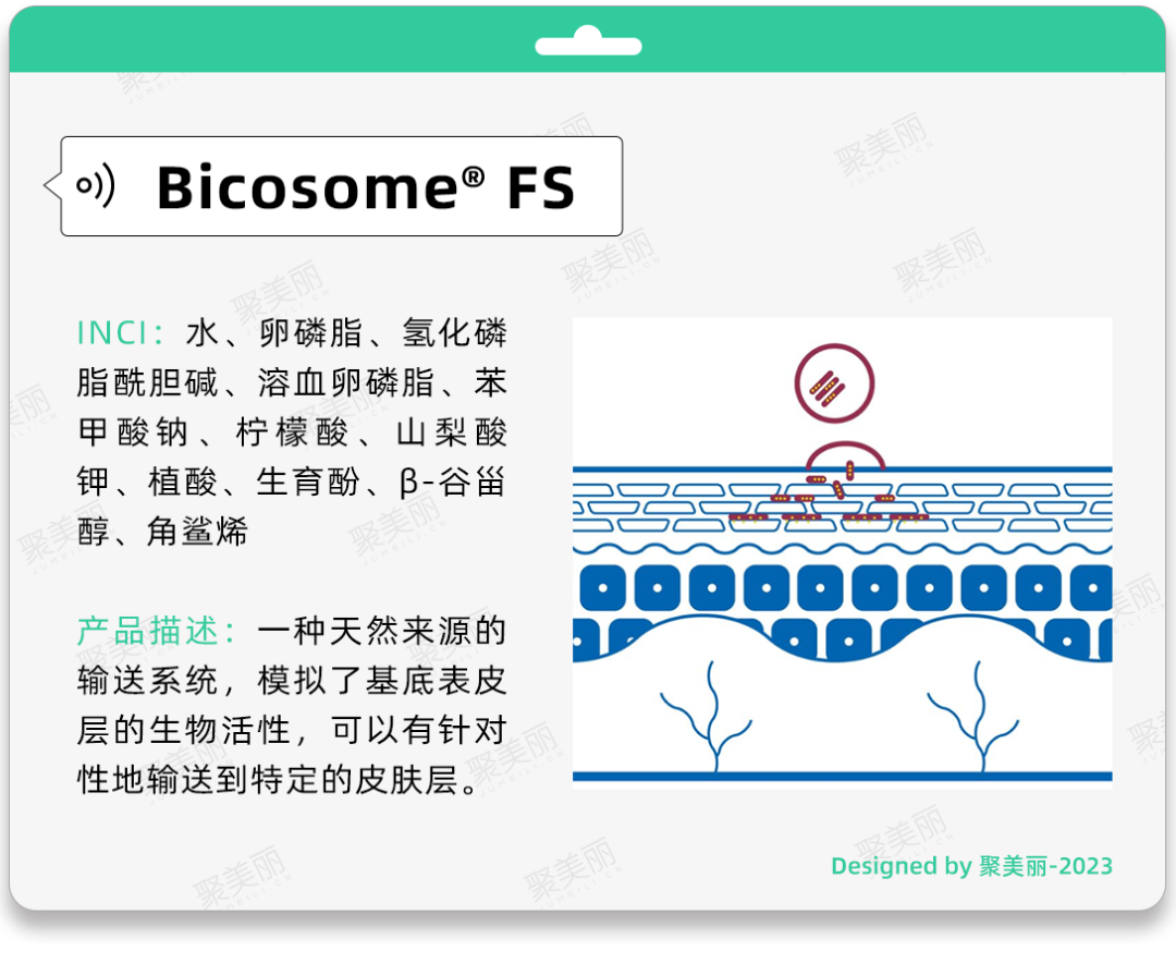 在Bicosome FS的研发过程中,他们借助了一种专利活性成分递送技术Bicomide ,能够通过创新的仿生机制,模仿皮肤自身的运输系统。