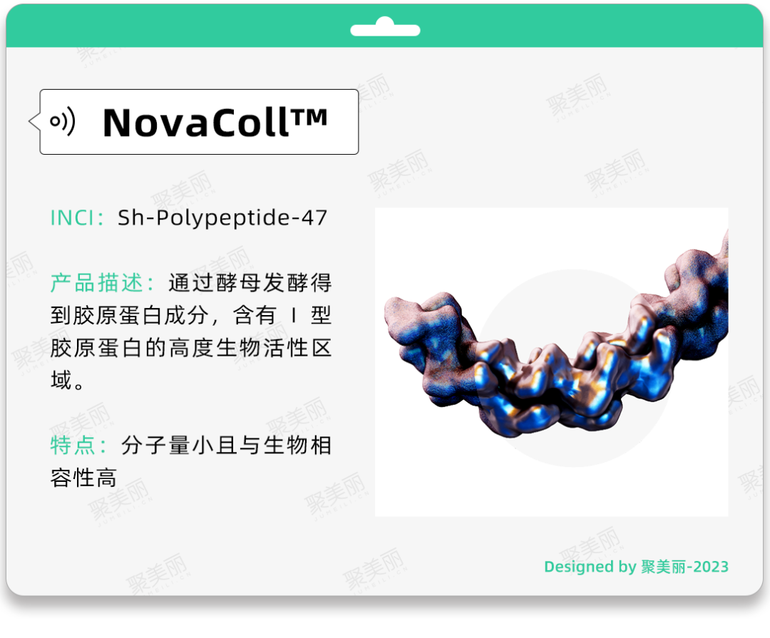 不同于其它胶原蛋白,NovaColl 的主要特点是分子量小且与生物相容性高。据该公司表示,其长度约为 1000 个氨基酸, 由于具备和皮肤胶原蛋白相同的氨基酸序列,这个成分可以提供较高水平的生物相容性,并在皮肤各层发挥强大的效果。