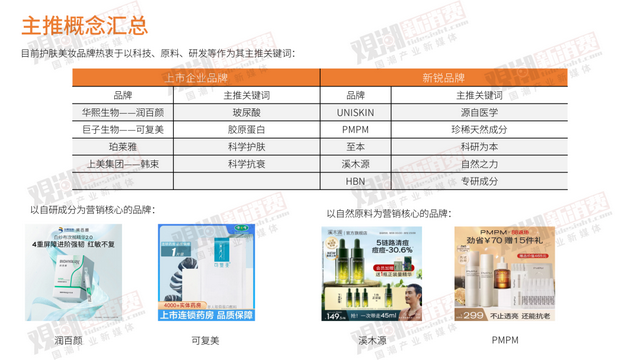 先给大家上一张总图,这是国货美妆头部品牌(包括上市公司和新锐品牌)主推的定位和概念,很明显可以看出现在科研之于品牌的分量。