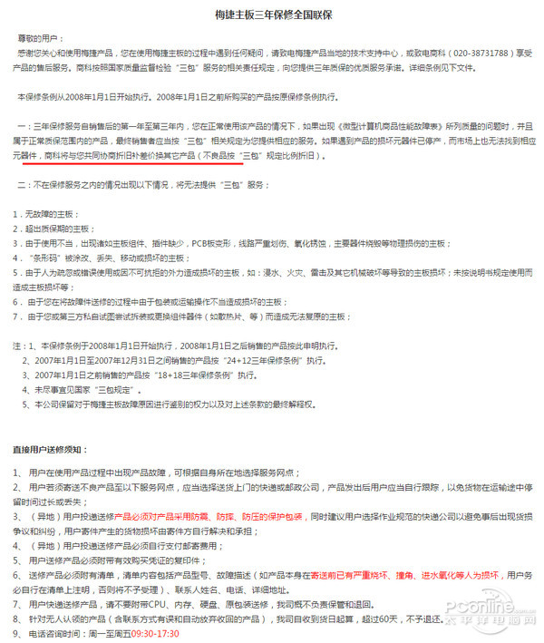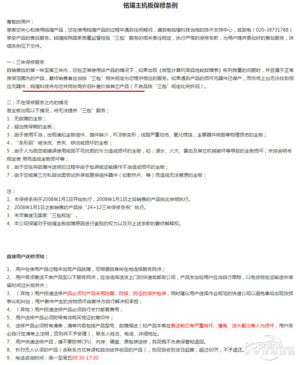 映泰的条款也有7天退货,三个月内有故障可以更换为同级别的良品,三年免费保修。