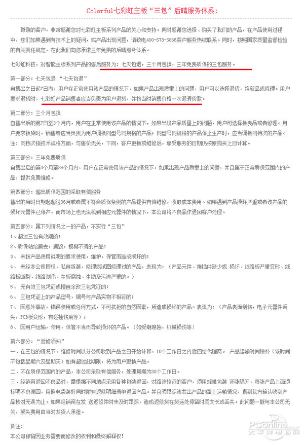 七彩虹也是七天退货,三个月换良品,三年保修,过三年之后可以付费维修。